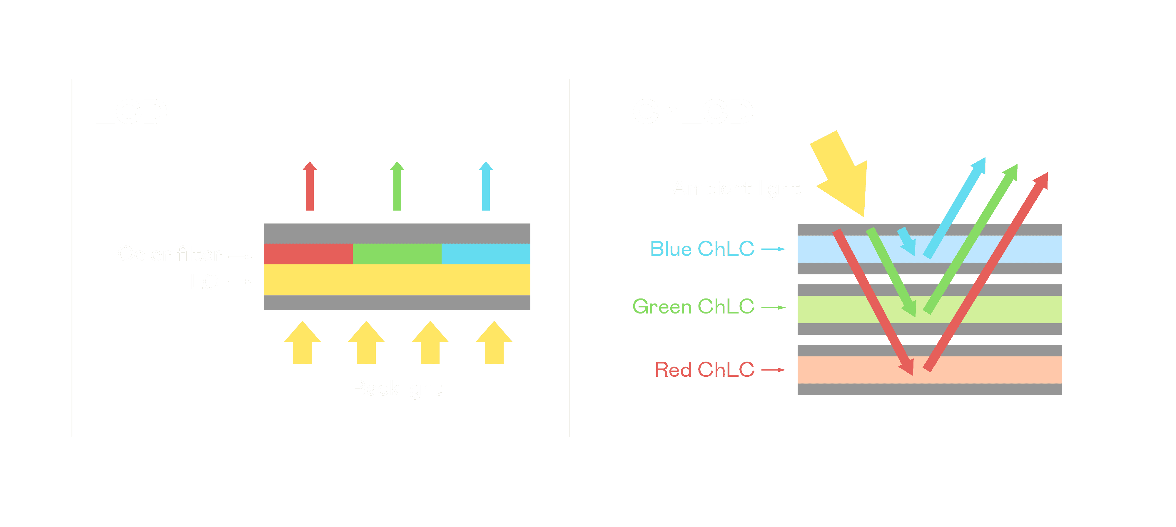 ChLCD 胆固醇液晶就如同纸张一样,,,透过反射环境光来显示影像,,,因此长时间观看不易造成人眼视觉疲劳,,可达到护眼效果。。当处于户外阳光下使用,,,,LCD 影像容易失真而不易观看,,,但胆固醇液晶仍可维持较佳的影像品质。。。。